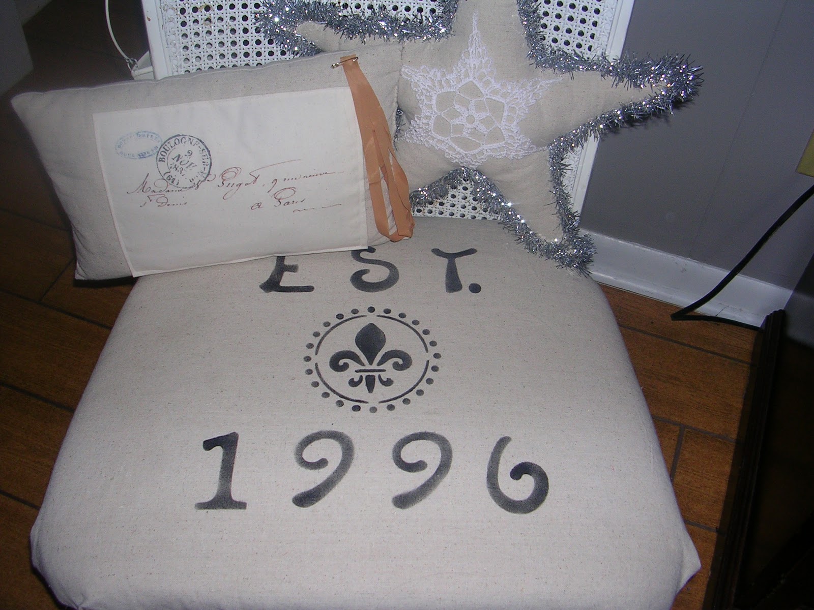 One of my drop cloth covered and stenciled chairs, and 2 dropcloth pillows. Is dropcloth one word, or two?????